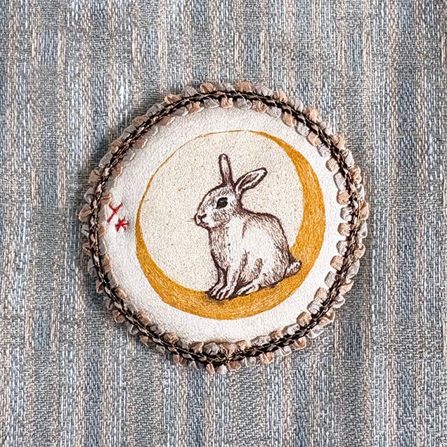 紅茶染めしたシルクの生地に刷った銅版画は、三日月にお座りするうさぎさん。タイトルは『月のうさぎ』です。